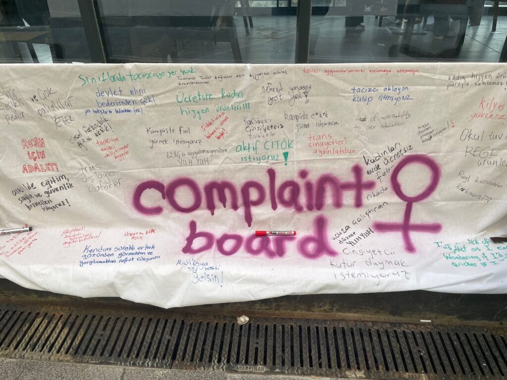 Complaint Board hazırlayarak kampüslerde görünmez kılınan erkek şiddetini susturulmaya çalışılan seslerimiz ile yazılı formatta aktarmayı amaçladık. Her türlü deneyimi ve her kadın ve LGBTİ+ öznenin görünür kılınmasını amaçladık. Çoğunluk bizi duymak istemezken, bizi sustururken biz kadınlar sesimizi kampüste yazılı olarak aktardık. Birbirimizin deneyimlerine kulak vermenin, görünür kılmanın yasaklandığı düzlemde politik bir direnme biçimi olarak şikayet ettik. Özel Güvenlik Birimleri tarafından uyarılar almamıza rağmen biz kadınlar ve LGBTİ+’lar yaşadıklarımızın isyanı ile kimliklerimizden vazgeçmedik. Varoluşumuzu, kimliğimizi, yönelimimizi kriminalize etmeye çalışan güç mekanizmalarına karşı taleplerimizi, mücadele yöntemlerimizi şikayet tablosunda belirtmek, direnişimizi görünür kılmanın yollarından biri oldu bizim için. Mücadelenin çoklu yöntemine inanarak, şikayet etmenin de direnişin bir parçası olduğunu gördük. Bu durumda Sara Ahmed’i anmakta fayda var. Sara Ahmed’in de dediği gibi “Her bir tanıklığı takip eden, şikâyette bulunmuş olmanın bize ne yaptığına ve nasıl hissettirdiğine dair konuşmalarımızı, bu çabayı ortaklaştırma biçimimiz olarak düşünüyorum. Şikâyette bulunmak, kırılganlığınızı arttırdığı gibi sorumluluk hissinizi de pekiştirebilir; böylesine parçalayıcı deneyimleri paylaşmanın ne kadar zor ama aynı zamanda ne kadar elzem olduğunun, zor olanın elzem olana ne kadar yakın olduğunun farkındasınızdır.”